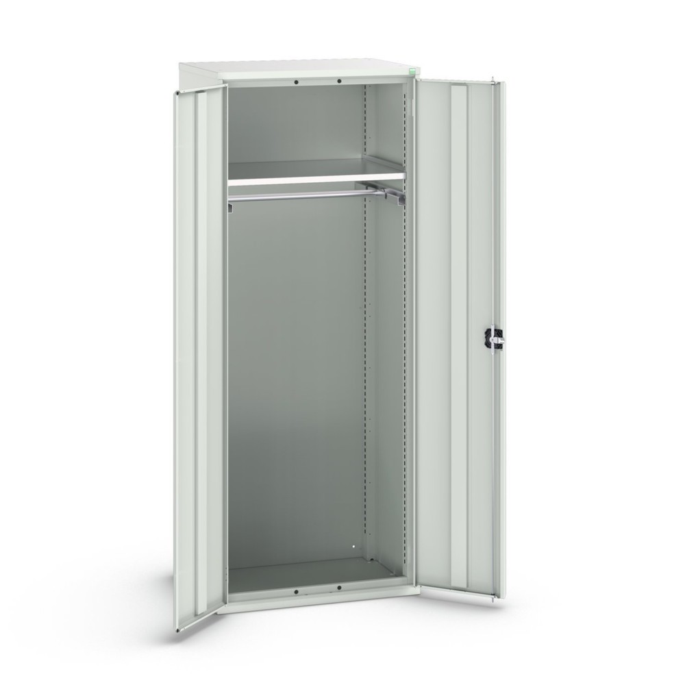 - Con robusto alloggiamento in lamiera d'acciaio completamente saldato, due ante rinforzate, un ripiano regolabile in altezza in lamiera d'acciaio zincata (capacità di carico: 75 kg) e un’asta appendiabiti