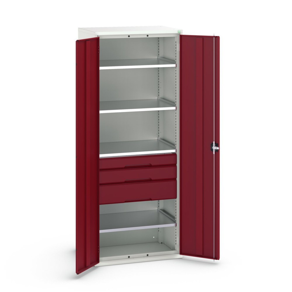 - Con robusto alloggiamento in lamiera d'acciaio completamente saldato, due ante alte e rinforzate, 4 ripiani regolabili in altezza in lamiera d'acciaio zincata (capacità di carico: 75 kg) e 1x 100 mm, 1x 125 mm e 1x 175 mm cassetti a estrazione completa (capacità di carico: 75 kg)