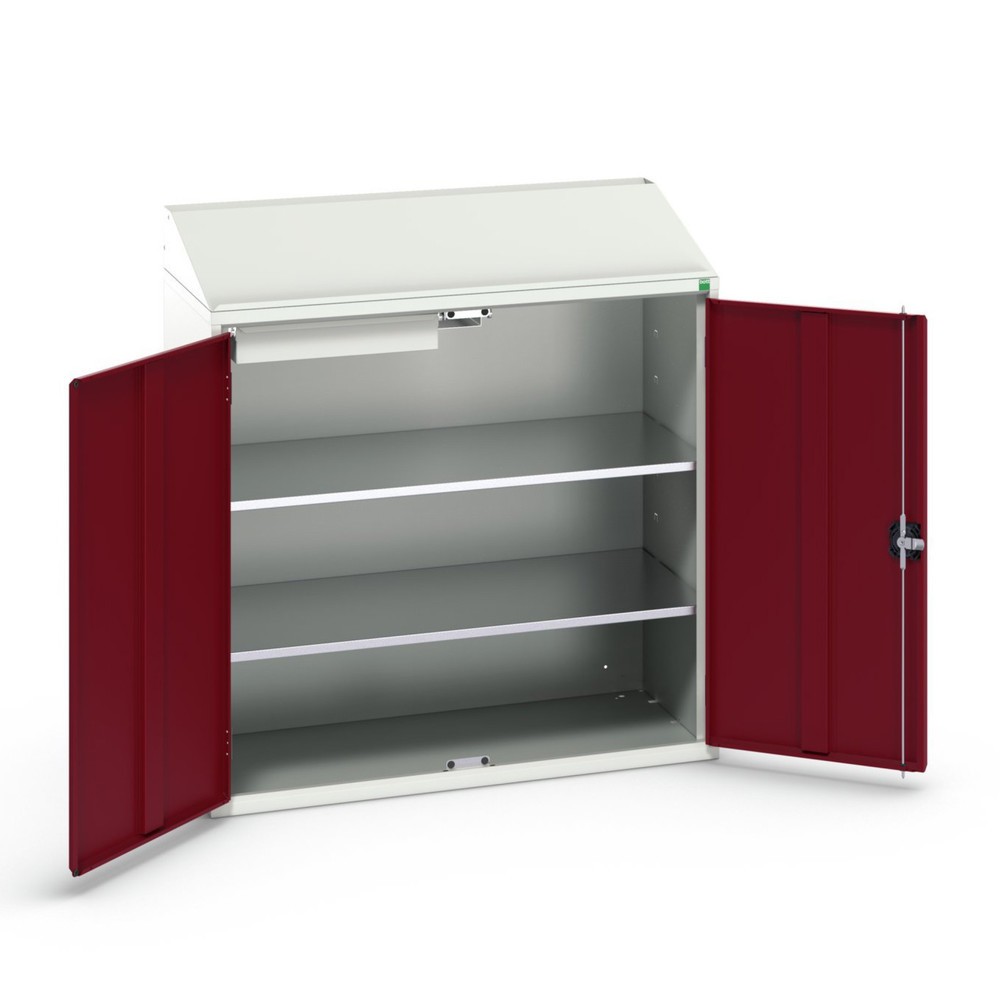 - Con alloggiamento in lamiera d'acciaio saldata dotato di scrittoio inclinato, armadio con serratura, due ante rinforzate, due ripiani regolabili in altezza in lamiera d'acciaio zincata (capacità di carico: 35 kg) e due vassoi estraibili a mezza larghezza (capacità di carico: 10 kg)
