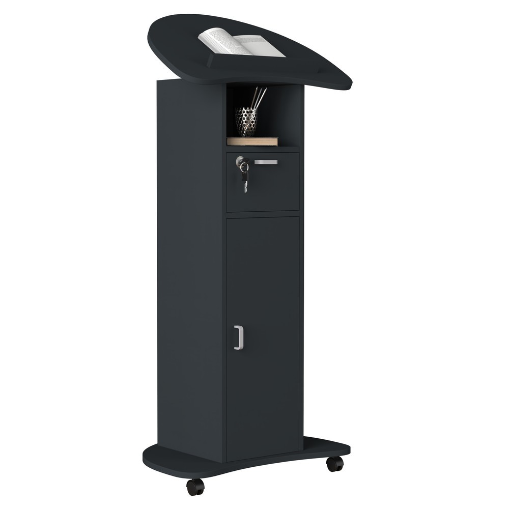Il Leggio su ruote VCM Redola L offre una soluzione mobile e funzionale per presentazioni e conferenze. La struttura con porta girevole e 2 scomparti crea spazio di stoccaggio sufficiente per i vostri documenti e materiali. Grazie ai 4 rulli di scorrimento, di cui 2 regolabili, il leggio può essere posizionato in modo flessibile e sicuro in diverse postazioni. Il pannello dello scrittoio inclinabile garantisce una presentazione ergonomica e confortevole. Grazie al suo design compatto, lo scrittoio è adatto a svariati spazi per eventi e ambienti di lavoro.