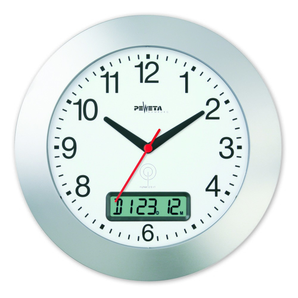 Orologio da parete radiocomandato PEWETA DCF77 modello 170, datario, Ø 300 mm, argento opaco