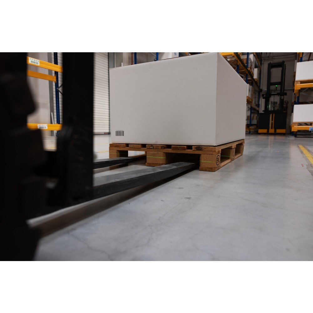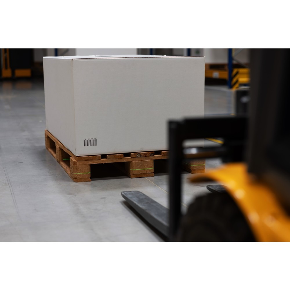 Il sistema proietta una linea laser verde sul supporto di carico da prelevare, consentendo un allineamento preciso e rapido della forca del carrello durante il prelievo e il deposito. In stato di inattività, la guida laser delle forche viene disattivata e passa alla modalità di risparmio energetico.