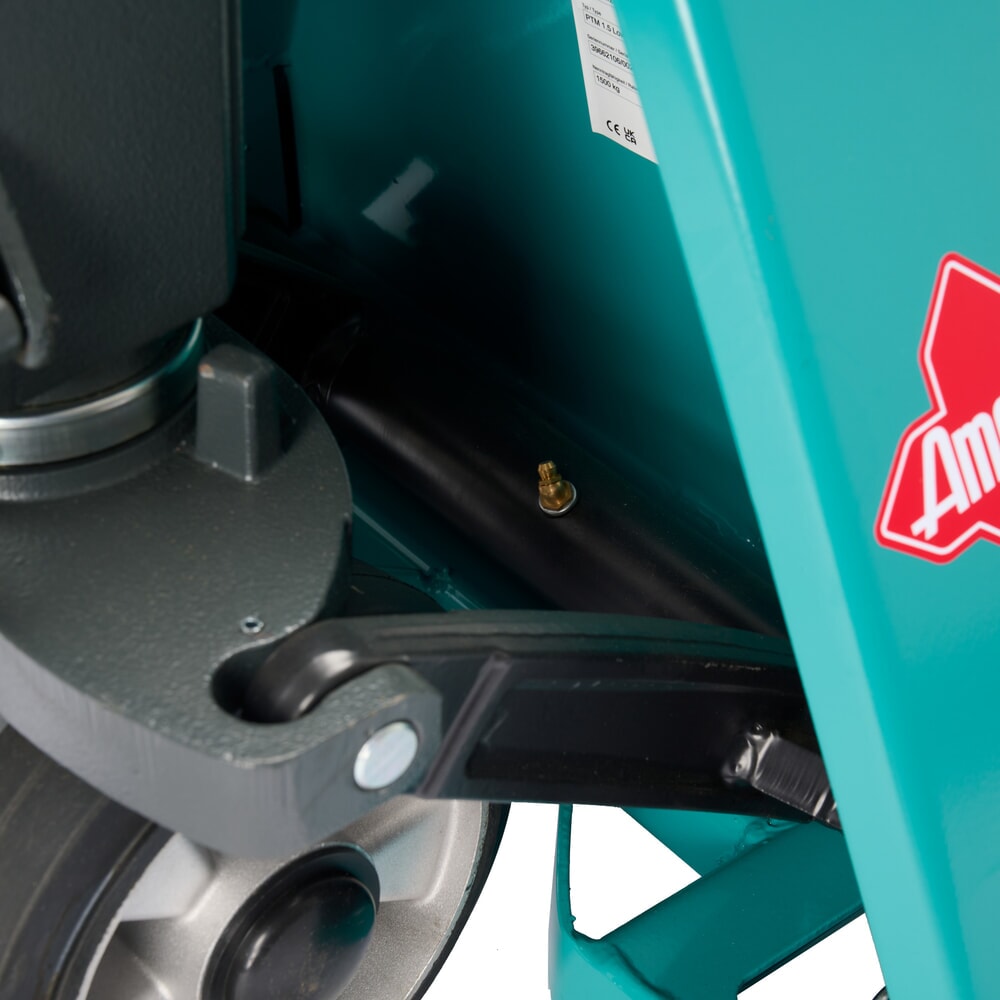 Piccoli ingrassatori su le parti mobili garantiscono una lubrificazione sufficiente e semplificano la manutenzione. Le ruote sterzanti con cerchi in alluminio e gommatura piena offrono un'elevata aderenza al suolo, una ridotta rumorosità di marcia e un buon comfort di ammortizzazione. Inoltre sono resistenti alle sostanze chimiche, a prova di guasto ed esenti da manutenzione. I rulli forche in poliuretano offrono una traslazione di qualità, confortevole e silenziosa, un'elevata portata e una lunga durata. In base al tipo di impiego, è possibile scegliere tra gommatura semplice e gommatura tandem.